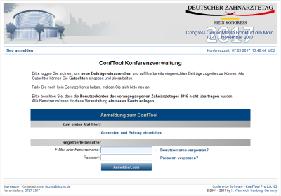 Die Vortragsanmeldung sowie die Abstractverwaltung für den Deutschen Zahnärztetag 2017 erfolgen zentral über eine eigene Internetseite. Auf dieser Seite können auch Poster für die Posterausstellung eingereicht werden - Autoren haben die Wahl, ob sie lieber einen Kurzvortrag oder ein Poster präsentieren möchten.