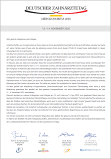 Verlegung des wissenschaftlichen Kongresses im Rahmen des Deutschen Zahnärztetages auf den 5. und 6. November 2021 in Form eines Online-Kongresses.